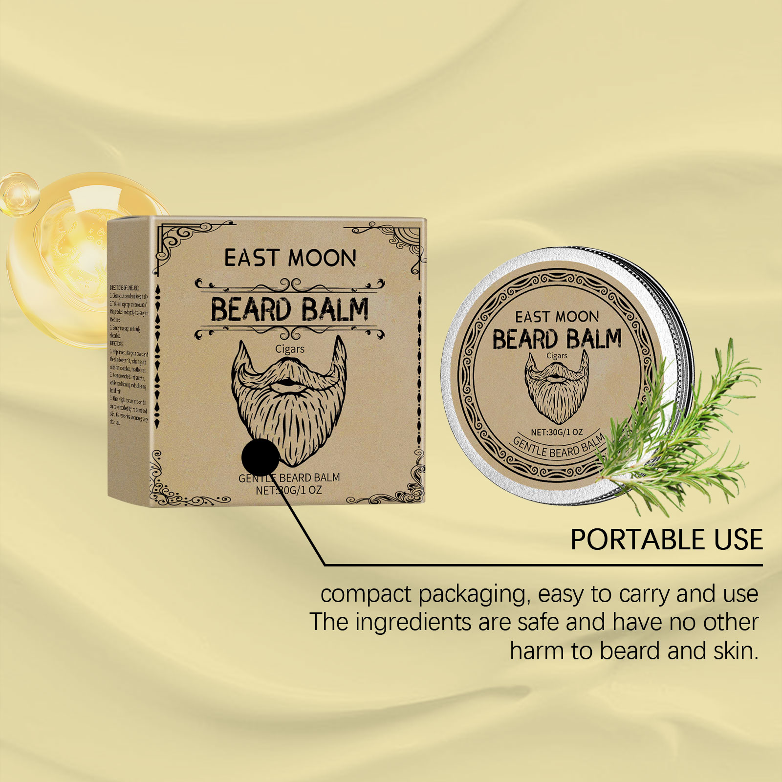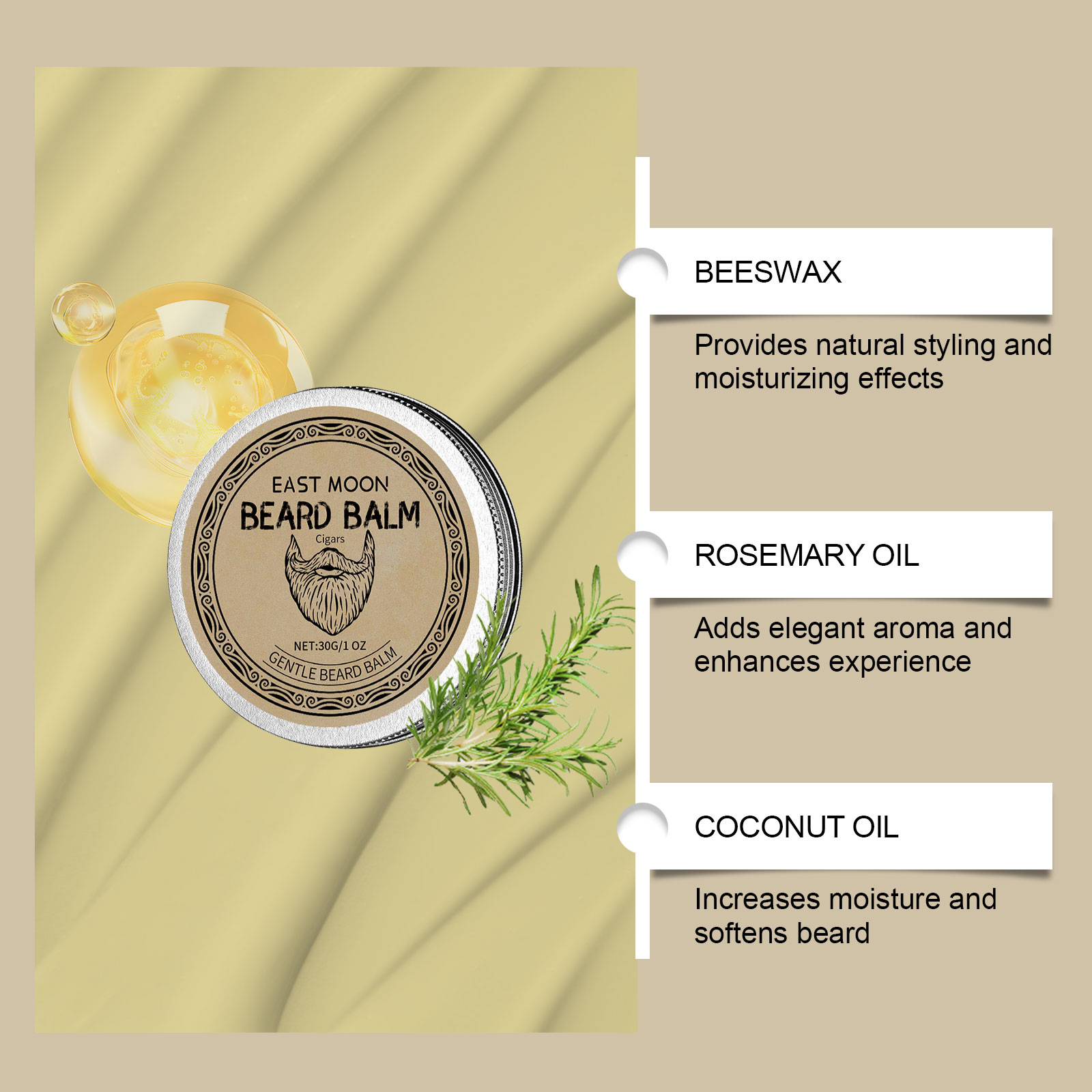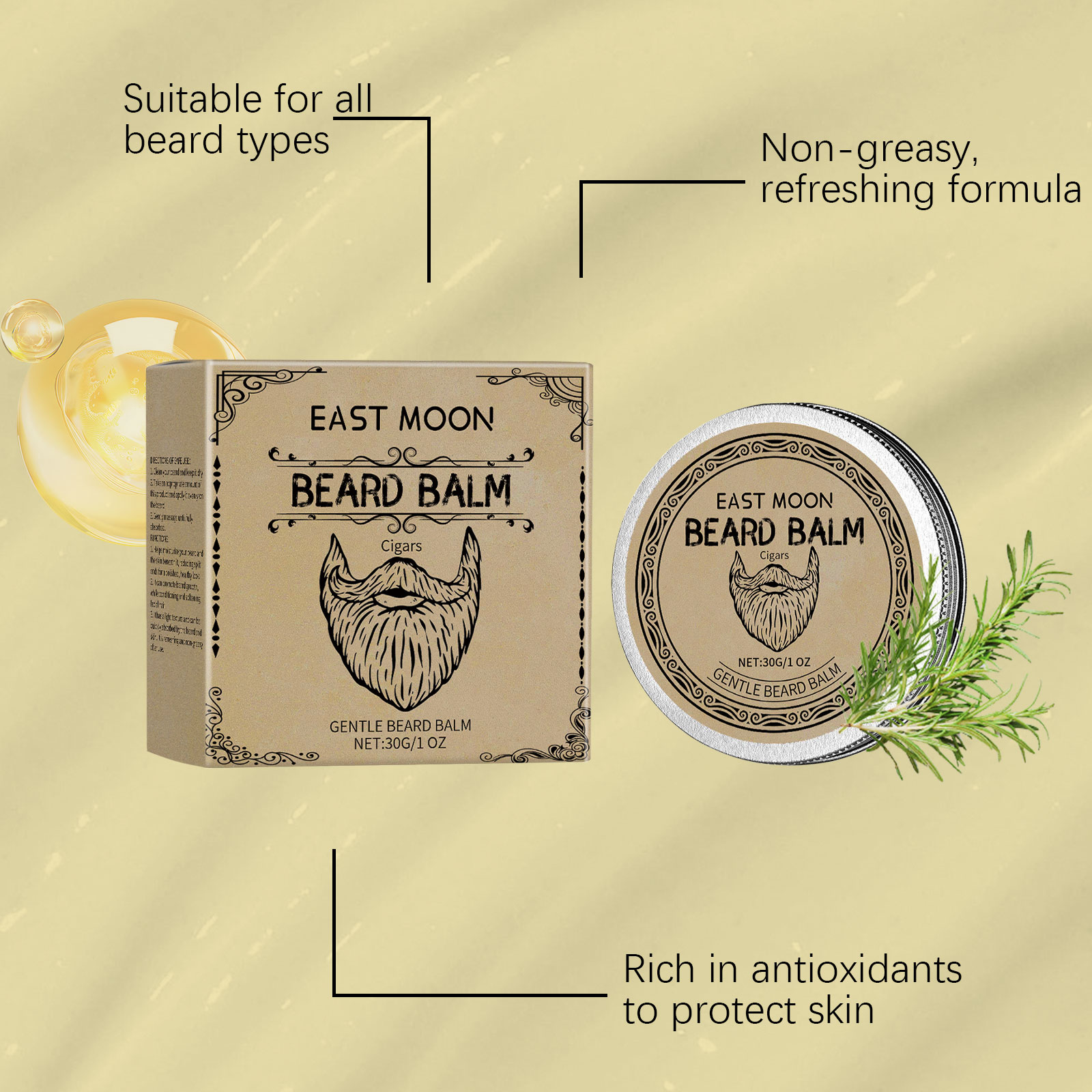 Experience mature elegance with the East Moon Cigar Beard Wax, crafted to give your beard a refined, natural shine. This premium blend of beeswax, rosemary oil, and coconut oil nourishes and softens beard hair while providing flexible hold and moisture. It smooths frizz, keeps your beard in shape, and enhances your overall grooming routine with a subtle, distinguished scent.