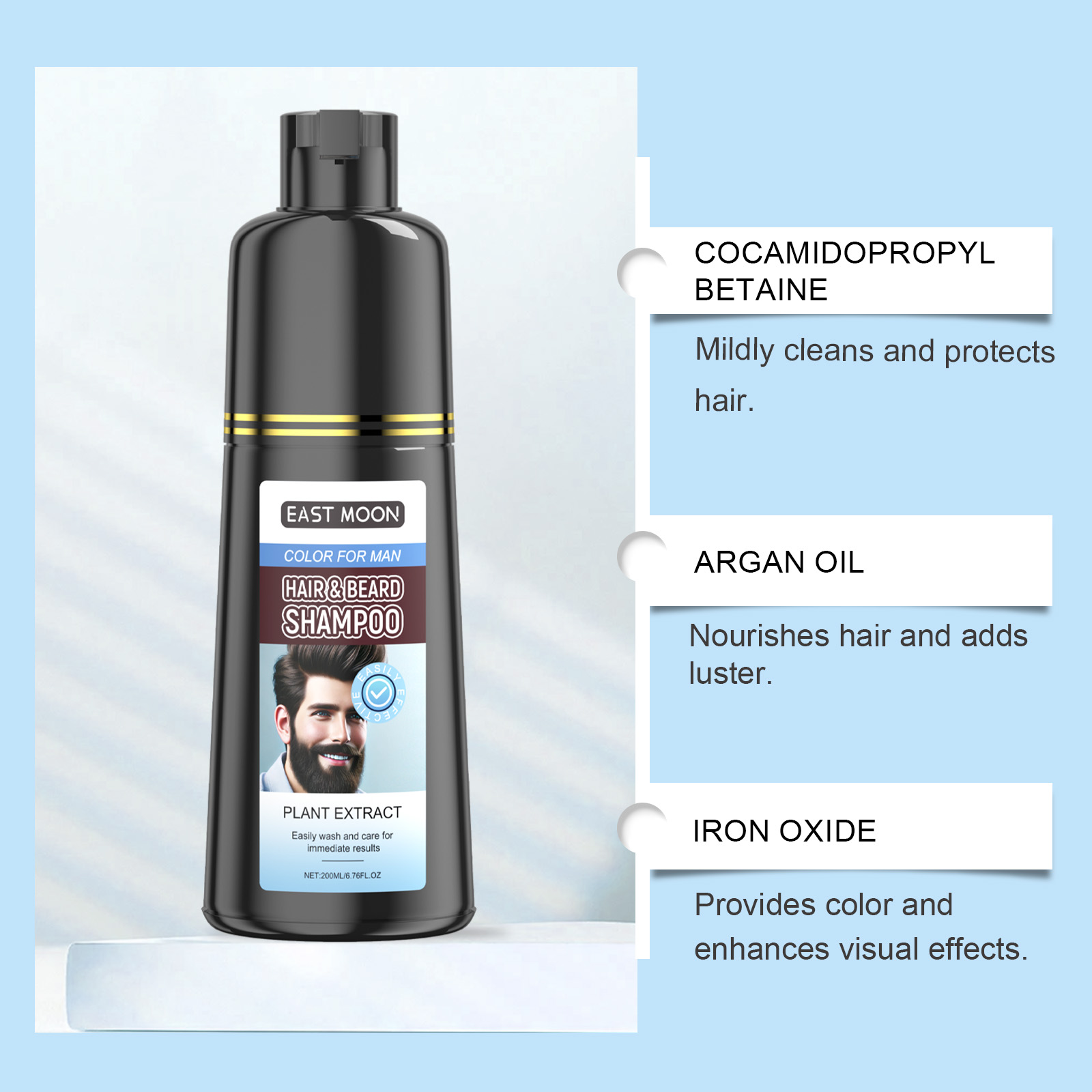 Transform your look with East Moon Men’s Black Beard Dye Lotion — the quick, effortless way to achieve a natural black beard. This advanced formula evenly colors your beard while nourishing the skin beneath. Infused with Moroccan Argan Oil and Iron Oxides, it hydrates, strengthens, and smooths your beard for a healthy, polished appearance. Perfect for daily or occasional grooming to maintain a confident, youthful look.
